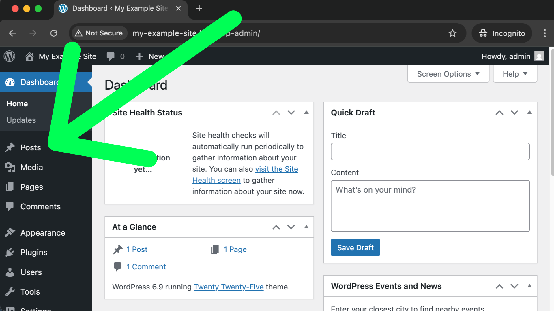 After publishing your first post you can use the “W” icon in the top left corner to go back to your dashboard. Feel free to create a 2nd and 3rd example post if you feel so inclined. At this point you might be curious where your posts are shown on your website? Remember, from the WordPress dashboard you can click the little home icon towards the top left to be taken to your public website.