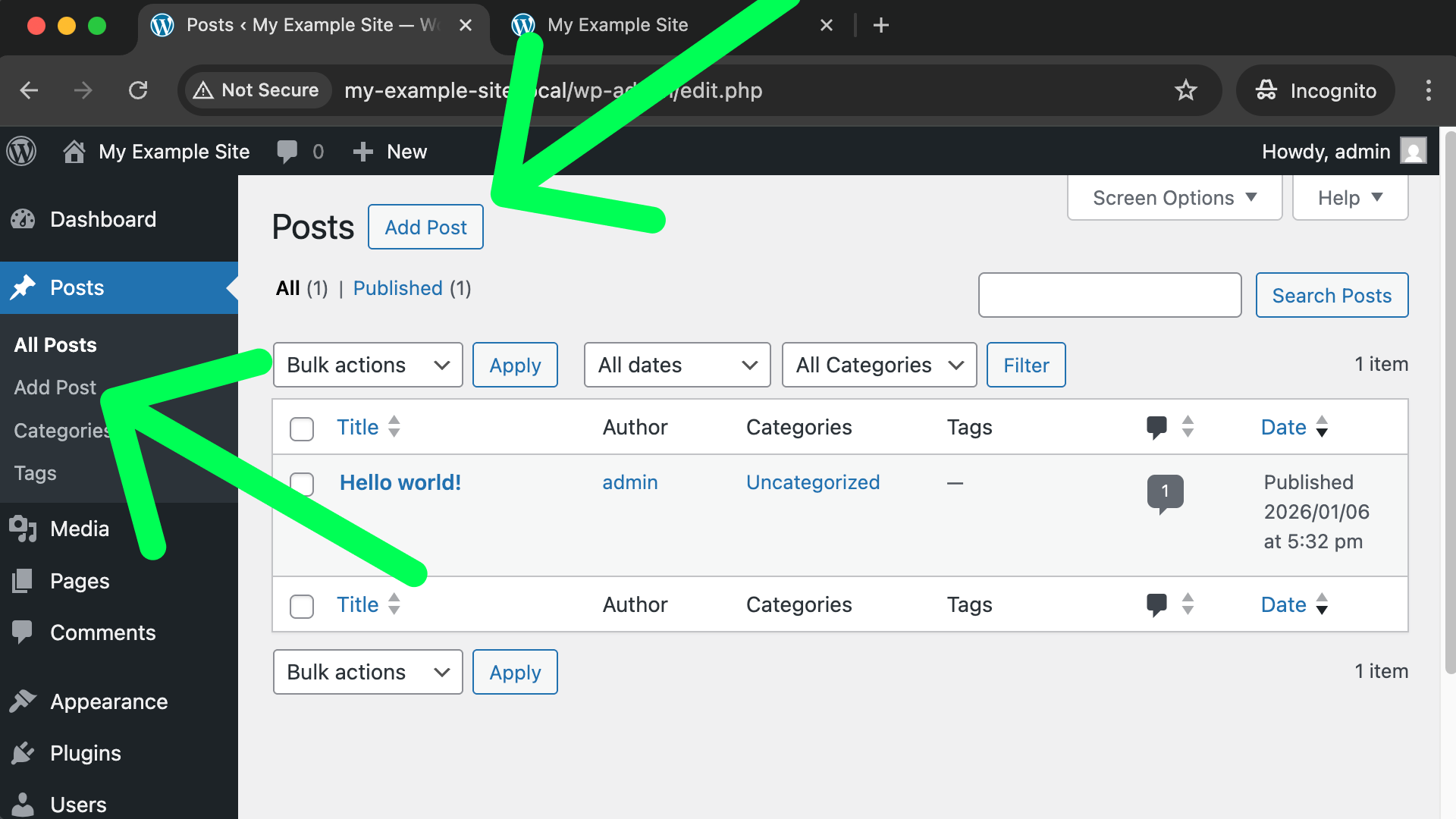 Just like with pages, you’ll be taken to a screen that shows you all of your currently existing posts. If you wanted to edit an existing post you can click on its title, but in our case we want to create a new post. The following screenshot shows you where to find the “Add Post” links.
